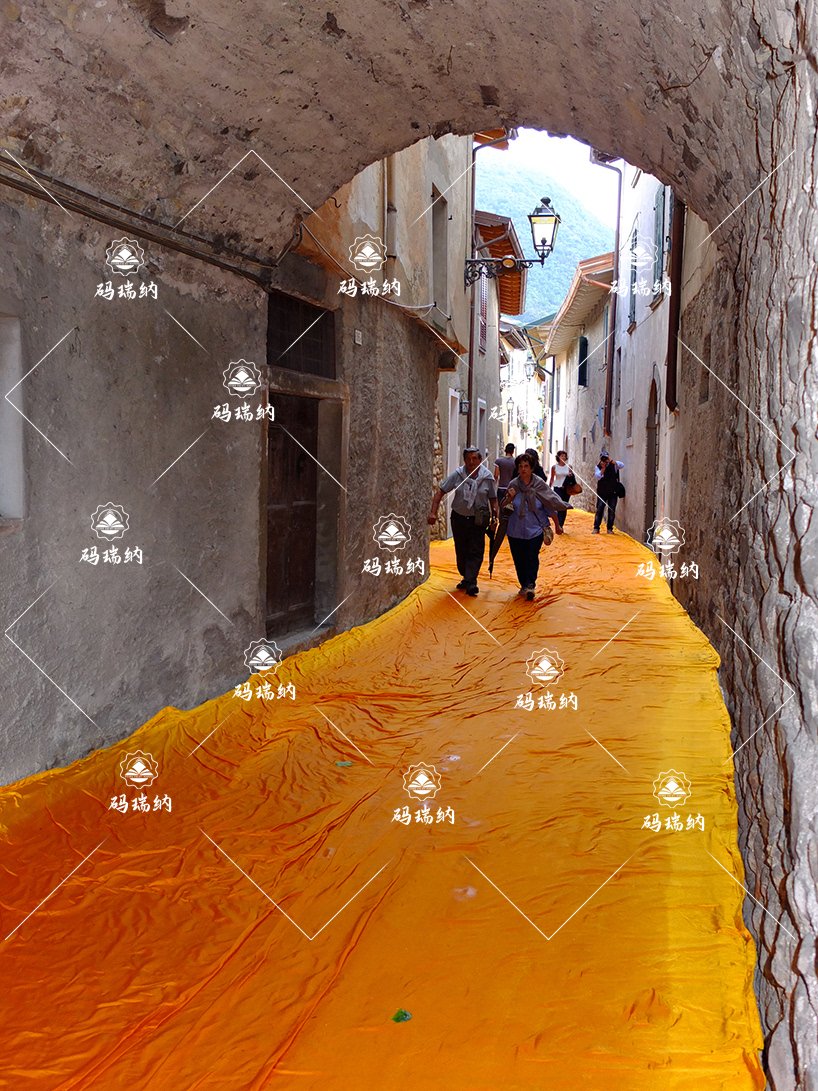 6月18號,藝術(shù)家 Christo創(chuàng)建的『水上浮橋/floating piers』公共藝術(shù)裝置完工,并正式向公眾開放。從空中或山上向下俯瞰,可以看到有近十萬平方米的明亮黃布覆蓋在水面的人行步道、覆蓋在巷道和廣場上,連接著意大利伊塞奧湖的幾個碼頭,總長度有3公里。游客可以從陸上的 sulzano 小鎮(zhèn)啟程,一路沿著隨水波微微晃動的黃色步道穿過水面抵達 monte 島,接著通向居于湖中的 san paolo 小島。